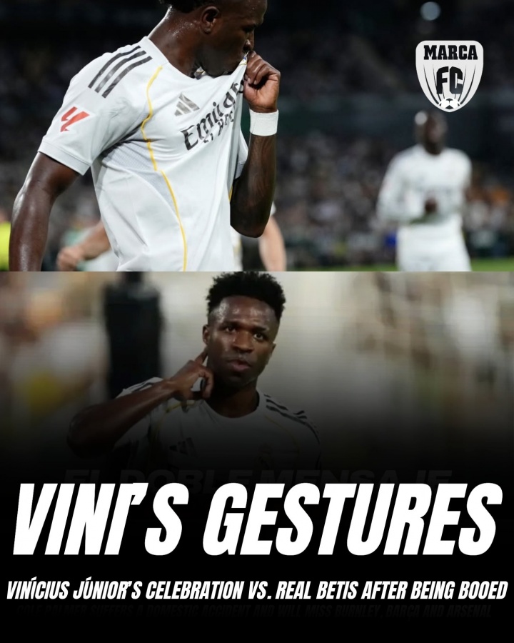 维尼修斯进球后让球场鸦雀无声,进球庆祝时,维尼修斯朝着看台做出了极具挑衅的回应动作,他用手指抵住耳朵,回击贝蒂斯球迷的漫天嘘声,随后又亲吻了皇马队徽。